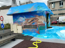 D'un vieux bloc de béton, vestige de l'ancien centre commercial de Villefontaine, Raf Péaud a donné à s'émouvoir aux habitants. La commande de la municipalité était de peindre les surfaces en s'inspirant des quatre éléments fondamentaux.